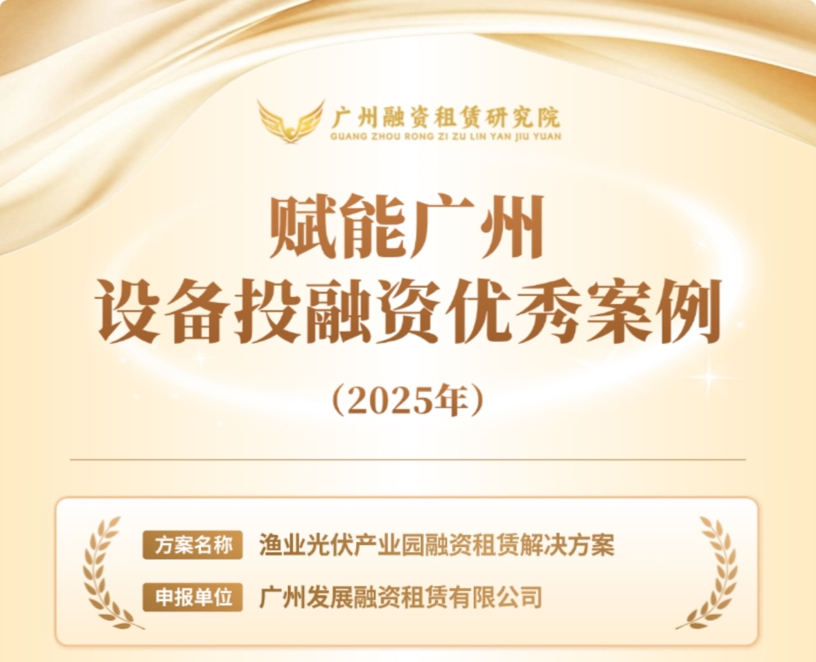 ??近日,在廣州融資租賃研究院組織開展的“賦能廣州·設(shè)備投融資優(yōu)秀案例(2025年)”征集活動(dòng)中,廣州發(fā)展融資租賃有限公司(以下簡(jiǎn)稱“融資租賃公司”)憑借“漁業(yè)光伏產(chǎn)業(yè)園融資租賃解決方案”,成功入選優(yōu)秀案例名單。