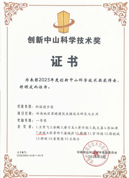 ??近日,由新能源集團總工程師、智慧能源公司總經理洪威、智慧能源公司能源服務事業部韓璘參與申報的“嶺南地區零碳建筑關鍵技術研究與應用”項目,獲得“2025年創新中山科學技術獎科技進步獎”一等獎。